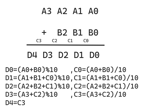 // C = A + B, A >= 0, B >= 0vector<int> add(vector<int> &A, vector<int> &B){ if (A.size() < B.size()) return add(B, A); vector<int> C; int t = 0; for (int i = 0; i < A.size(); i ++ ) { t += A[i]; if (i < B.size()) t += B[i]; C.push_back(t % 10); t /= 10; } if (t) C.push_back(t); return C;}