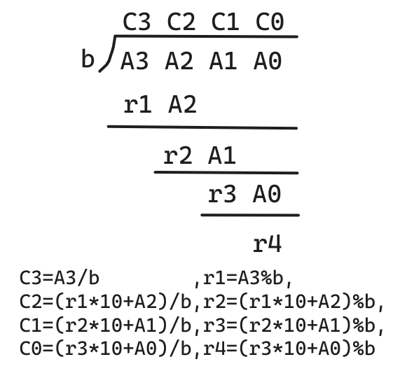 // A / b = C ... r, A >= 0, b > 0vector<int> div(vector<int> &A, int b, int &r){ vector<int> C; r = 0; for (int i = A.size() - 1; i >= 0; i -- ) { r = r * 10 + A[i]; C.push_back(r / b); r %= b; } reverse(C.begin(), C.end()); while (C.size() > 1 && C.back() == 0) C.pop_back(); return C;}