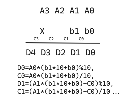 // C = A * b, A >= 0, b >= 0vector<int> mul(vector<int> &A, int b){ vector<int> C; int t = 0; for (int i = 0; i < A.size() || t; i ++ ) { if (i < A.size()) t += A[i] * b; C.push_back(t % 10); t /= 10; } while (C.size() > 1 && C.back() == 0) C.pop_back(); return C;}