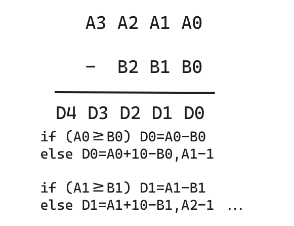// C = A - B, 满足A >= B, A >= 0, B >= 0// 如果不满足 A >= B 呢?只需要计算 -(B - A) 即可vector<int> sub(vector<int> &A, vector<int> &B){ vector<int> C; for (int i = 0, t = 0; i < A.size(); i ++ ) { t = A[i] - t; if (i < B.size()) t -= B[i]; C.push_back((t + 10) % 10); // 当t<0时需要借位,此时要+10,否则不必借位,因此将这两种情况合起来写 if (t < 0) t = 1; else t = 0; } while (C.size() > 1 && C.back() == 0) C.pop_back(); // 去掉前缀的0 return C;}