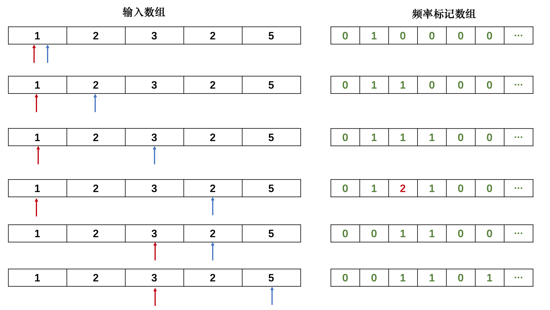 /*核心思路:遍历数组a中的每一个元素a[i], 对于每一个i,找到j使得双指针[j, i]维护的是以a[i]结尾的最长连续不重复子序列,长度为i - j + 1, 将这一长度与r的较大者更新给r。对于每一个i,如何确定j的位置:由于[j, i - 1]是前一步得到的最长连续不重复子序列,所以如果[j, i]中有重复元素,一定是a[i],因此右移j直到a[i]不重复为止(由于[j, i - 1]已经是前一步的最优解,此时j只可能右移以剔除重复元素a[i],不可能左移增加元素,因此,j具有“单调性”、本题可用双指针降低复杂度)。用数组s记录子序列a[j ~ i]中各元素出现次数,遍历过程中对于每一个i有四步操作:cin元素a[i] -> 将a[i]出现次数s[a[i]]加1 -> 若a[i]重复则右移j(s[a[j]]要减1) -> 确定j及更新当前长度i - j + 1给r。注意细节:当a[i]重复时,先把a[j]次数减1,再右移j。*/# include <iostream>using namespace std;const int N = 100010;int a[N], s[N];int main(){ int n, r = 0; cin >> n; for (int i = 0, j = 0; i < n; ++ i) { cin >> a[i]; ++ s[a[i]]; while (s[a[i]] > 1) -- s[a[j++]]; // 先减次数后右移 r = max(r, i - j + 1) ; } cout << r; return 0;}