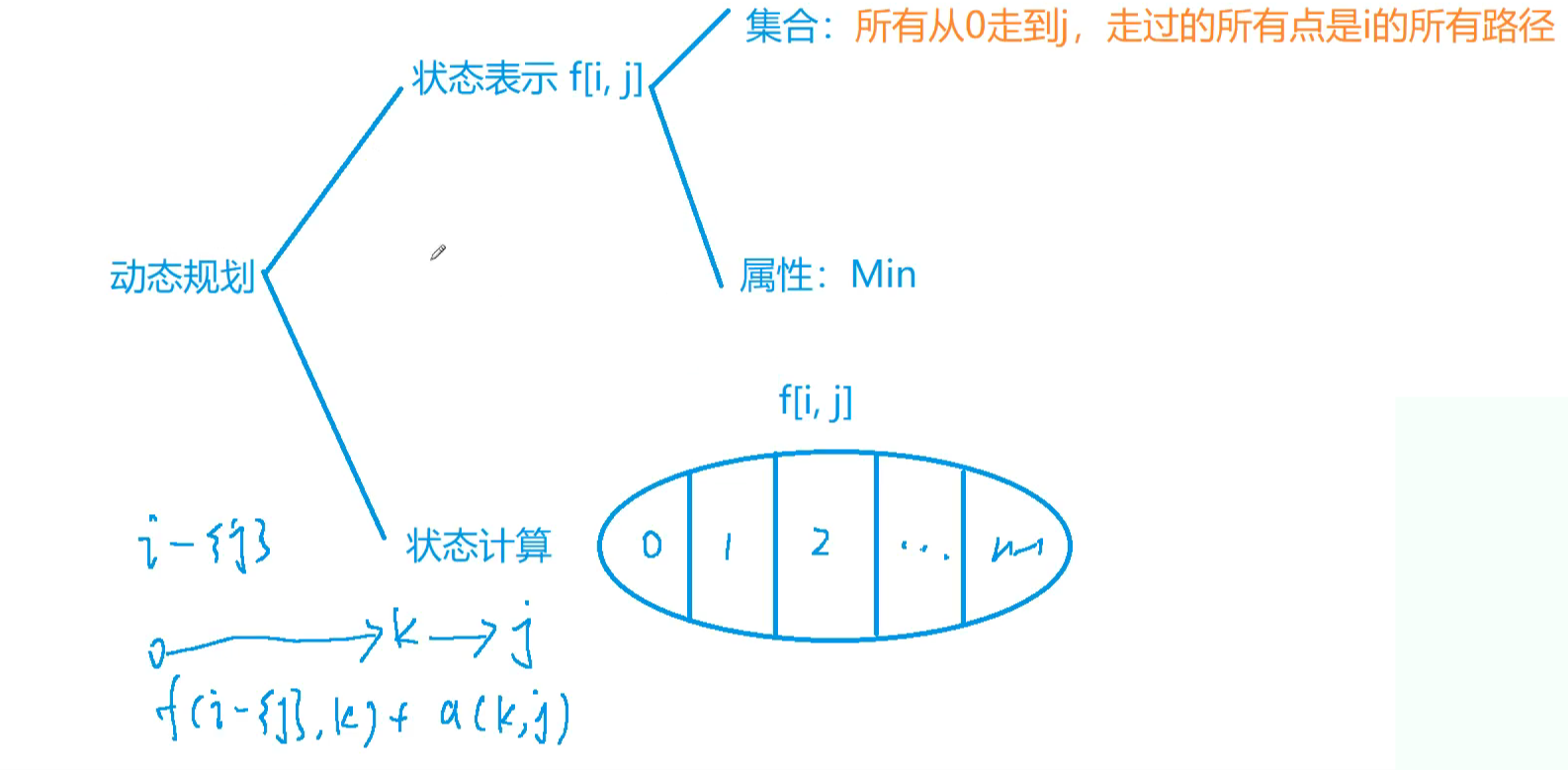 k:考虑所有可能的倒数第二个到达的顶点k,并基于此来更新f[i][j]的值。这里使用i - (1 << j)表示从状态i中去除顶点j后的状态,然后从该状态转移到新状态i(包括顶点j),且最后到达顶点j的最短路径长度。 -