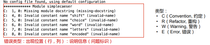 pylintrc文件中制定的编码标准约定不相符;R 类型报错是指该段代码写得极其糟糕,需要重构;W 类型报错是指其触发了 Python 特定的问题;E 类型报错是指代码中可能存在的语法等错误;