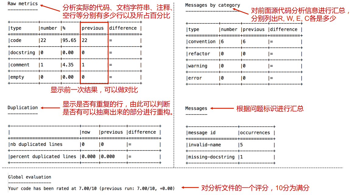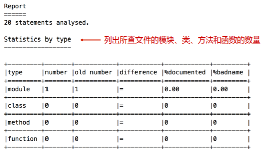 - 首先会报告 pylint 所检查文件的模块、类、方法和函数的数量: