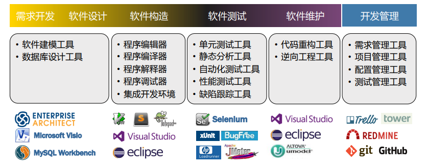- 针对每个软件开发的阶段,都需要对应的开发工具: