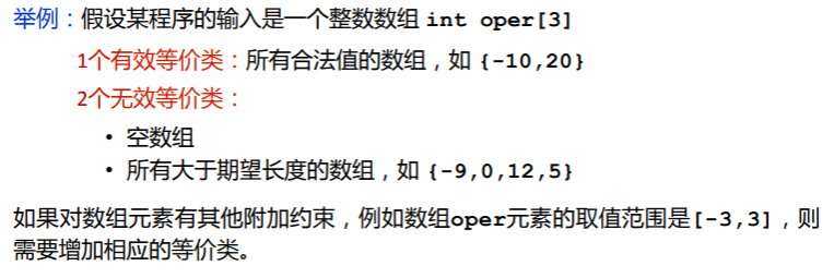 - 对于规定了类型和长度的数组变量,其长度和元素类型都可以作为等价类划分的依据: