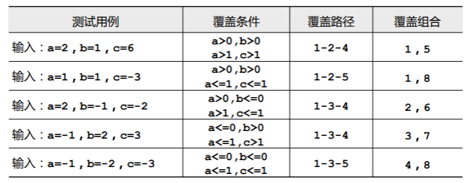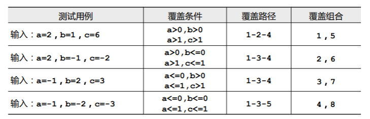 上面控制流图中我们可以设计测试样例 a=2,b=-1,c=-2 和 a=-1,b=2,c=3 。它们分别能够覆盖 a>0,b<=0,a>1,c<=1 和 a<=0,b>0,a<=1,c>1 这两个条件,即对 a>0 、b>0 、a>1 、c>1 这四个条件都进行了正反两个方向的判断。