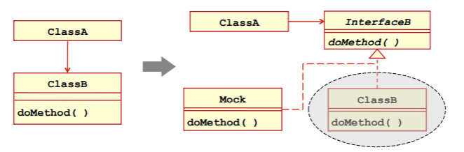 - 这就要用到 Mock 对象,即针对接口进行编程,被测试的代码通过接口来引用对象,再使用 Mock 对象模拟所引用的对象及其行为,因此被测试模块并不知道它所引用的究竟是真实对象还是 Mock 对象: