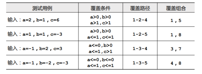 因此,很自然地我们就提出结合判定覆盖和条件覆盖,提出能够覆盖所有判断的所有分支、所有条件的所有方面:例如测试用例 a=2,b=1,c=6 能够覆盖 a>0,b>0,a>1,c>1 ,且判断均为 T ;而测试用例 a=-1,b=-2,c=-3 能够覆盖 a<=0,b<=0,a<=1,c<=1 ,且判断均为 F 。