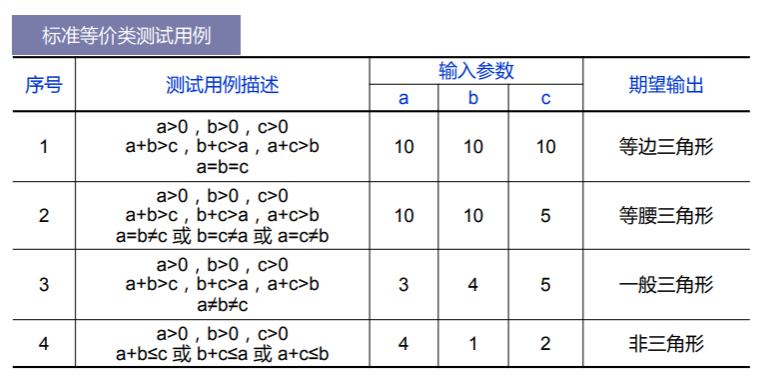 - 要注意,同一输入域的等价类划分可能不唯一,而不论如何划分,我们只需从每一个等价类中选取一个输入作为测试用例即可;