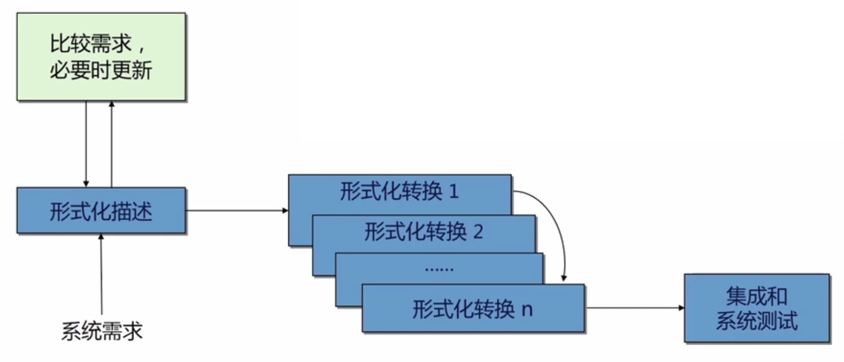 采用形式化的数学语言描述系统,再利用自动化手段通过一系列转换,将形式化的需求规格说明,变为可交付使用的系统: