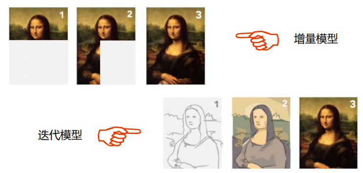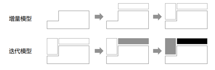 - 迭代模型:一开始提交一个完整系统,在后续发布中补充完善各子系统功能