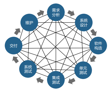 - 交付代码后并非万事大吉,还需要持续地改进,以适应不断变化的需求。一次开发终身使用的系统很少,将软件系统的开发和维护看成是一个连续过程更有意义