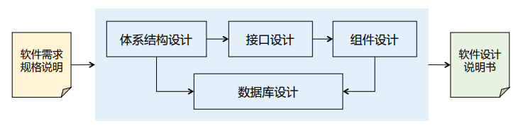 - 根据需求规格说明,确定软件体系结构,进一步设计每个系统部件的实现算法、数据结构及其接口等