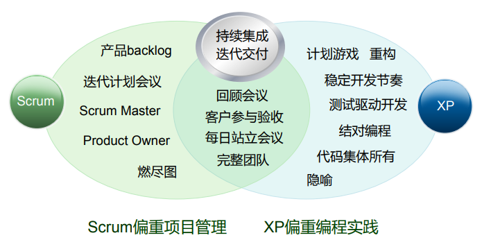 敏捷开发方法是一组轻量级开发方法的总称,包含很多具体的开发过程和方法,最有影响的两个方法是极限编程(XP)和 Scrum 开发方法。