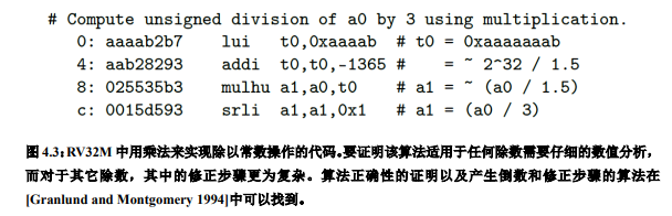在一条指令中完成把 64 位积写入两个 32 位寄存器的操作会使硬件设计变得复杂,所以 RV32M 需要两条乘法指令才能得到一个完整的 64 位积。 对许多微处理器来说,整数除法是相对较慢的操作。如前述,除数为 2 的幂次的无符号除法可以用右移来代替。事实证明,通过乘以近似倒数再修正积的高 32 位的方法,可以优化除数为其它数的除法。例如,图 4.3 显示了 3 为除数的无符号除法的代码。