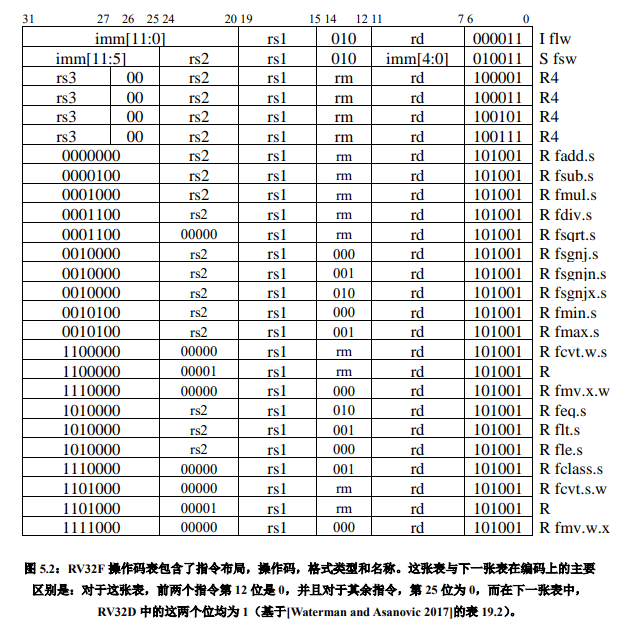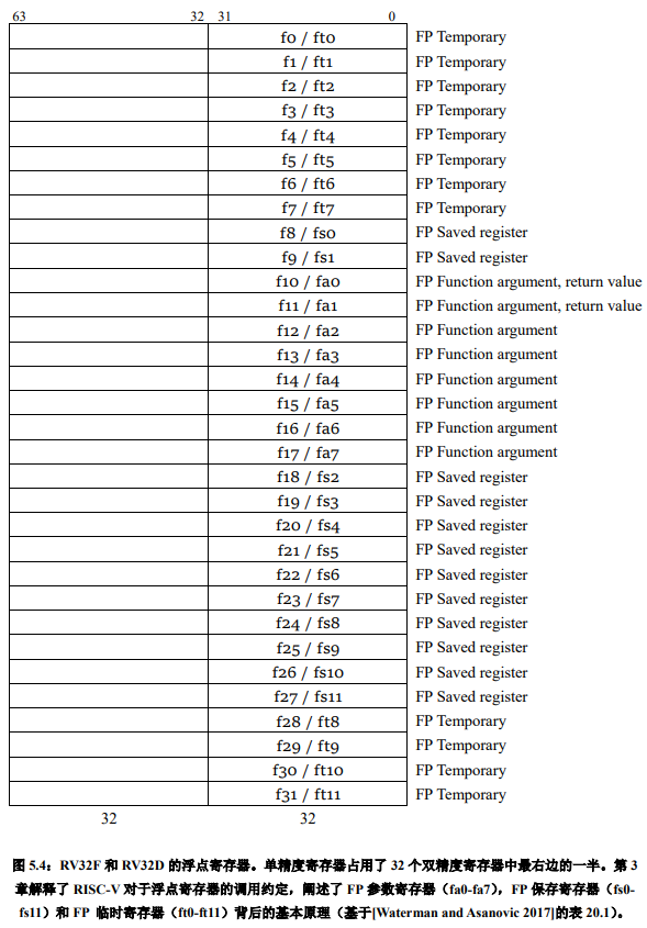 使用两组寄存器对 RISC-V 指令集的主要影响是,必须要添加新的指令来加载和存储数据 f 寄存器,还需要添加新指令用于在 x 和 f 寄存器之间传递数据。图 5.4 列出了 RV32D 和 RV32F 寄存器及对应的由 RISC-V ABI 确定的寄存器名称。