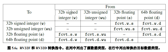 RV32F 和 RV32D 支持在 32 位有符号整数,32 位无符号整数,32 位浮点和 64 位之间浮点进行所有组合的转换(只要这个转换是有用,有意义的)。图 5.6 按源数据类型以及 转换后的目的数据类型,罗列了这 10 条指令。