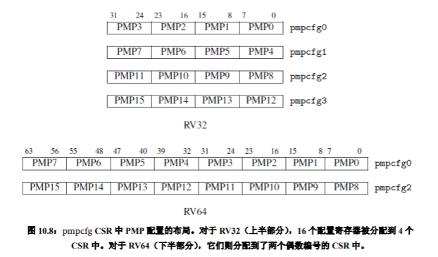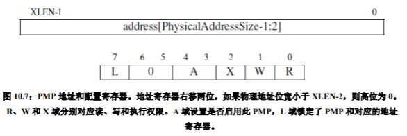 配置寄存器密集地填充在 CSR 中以加速上下文切换,如图 10.8 所示。PMP 的配置由 R、W 和 X 位组成,他们分别对于 load,store 和 fetch 操作,还有另一个域 A,当它为 0 时禁用此 PMP,当它为 1 时启用。PMP 配置还支持其他模式,还可以加锁,[Waterman and Asanovic 2017] 中描述了这些功能。