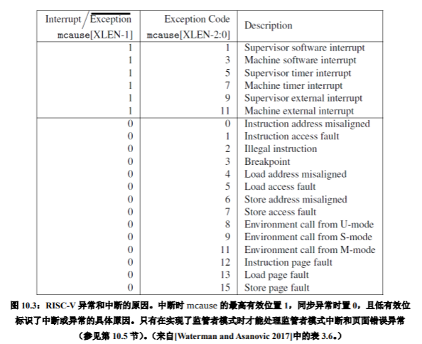RISC-V 中实现精确异常:保证异常之前的所有指令都完整地执行了,而后续的指令都没有开始执行(或等同于没有执行)。图 10.3 列出了触发标准异常的原因。