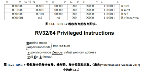 图 10.1 是 RISC-V 特权指令的图形表示,图 10.2 列出了这些指令的操作码。显然,特权架构添加的指令非常少。作为替代,几个新的控制状态寄存器(CSR)显示了附加的功能。