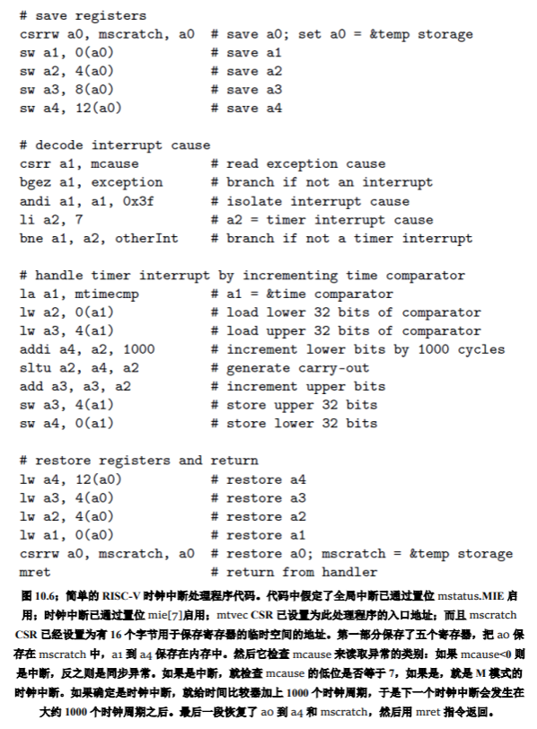 图 10.6 展示了遵循此模式的基本时钟中断处理程序的 RISC-V 汇编代码。它只对时间比较器执行了递增操作,然后继续执行之前的任务。更实际的时钟中断处理程序可能会调用调度程序,从而在任务之间切换。它是非抢占的,因此在处理程序的过程中会禁用中断。不考虑这些限制条件的话,它就是一个只有一页的 RISC-V 中断处理程序的完整示例!