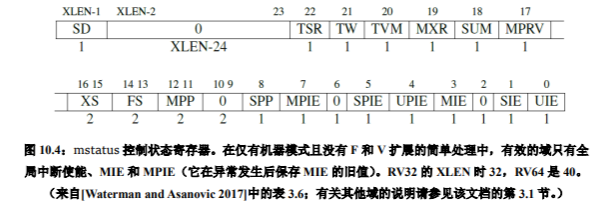 - mstatus(Machine Status)它保存全局中断使能,以及许多其他的状态,如图 10.4 所示。