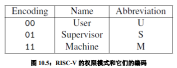 - 发生异常之前的权限模式保留在 mstatus 的 MPP 域中,再把权限模式更改为 M。图 10.5 显示了 MPP 域的编码(如果处理器仅实现 M 模式,则有效地跳过这个步骤)。