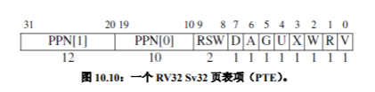 图 10.10 显示了 Sv32 页表项(page-table entry,PTE)的布局,从右到左分别包含如下所述的域:
