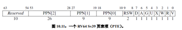 图 10.11 显示了 Sv39 页表项的布局。它和 Sv32 完全相同,只是 PPN 字段被扩展到了 44 位,以支持 56 位的物理地址,或者说 2^26 GiB 大小的物理地址空间。