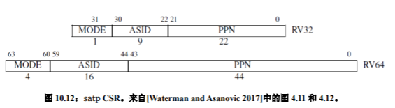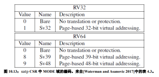 - MODE 域可以开启分页并选择页表级数,图 10.13 展示了它的编码。
