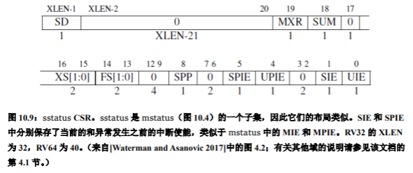 S 模式有几个异常处理 CSR:sepc、stvec、scause、sscratch、stval 和 sstatus,它们执行与 10.2 中描述的 M 模式 CSR 相同的功能。图 10.9 显示了 sstatus 寄存器的布局。监管者异常返回指令 sret 与 mret 的行为相同,但它作用于 S 模式的异常处理 CSR,而不是 M 模式的 CSR。