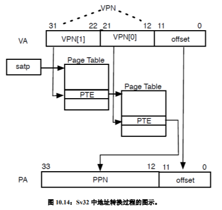 satp.PPN给出了一级页表的基址,VA[31:22]给出了一级页号,因此处理器会读取位于地址(satp.PPN × 4096 + VA[31: 22] × 4)的页表项。- 该 PTE 包含二级页表的基址,