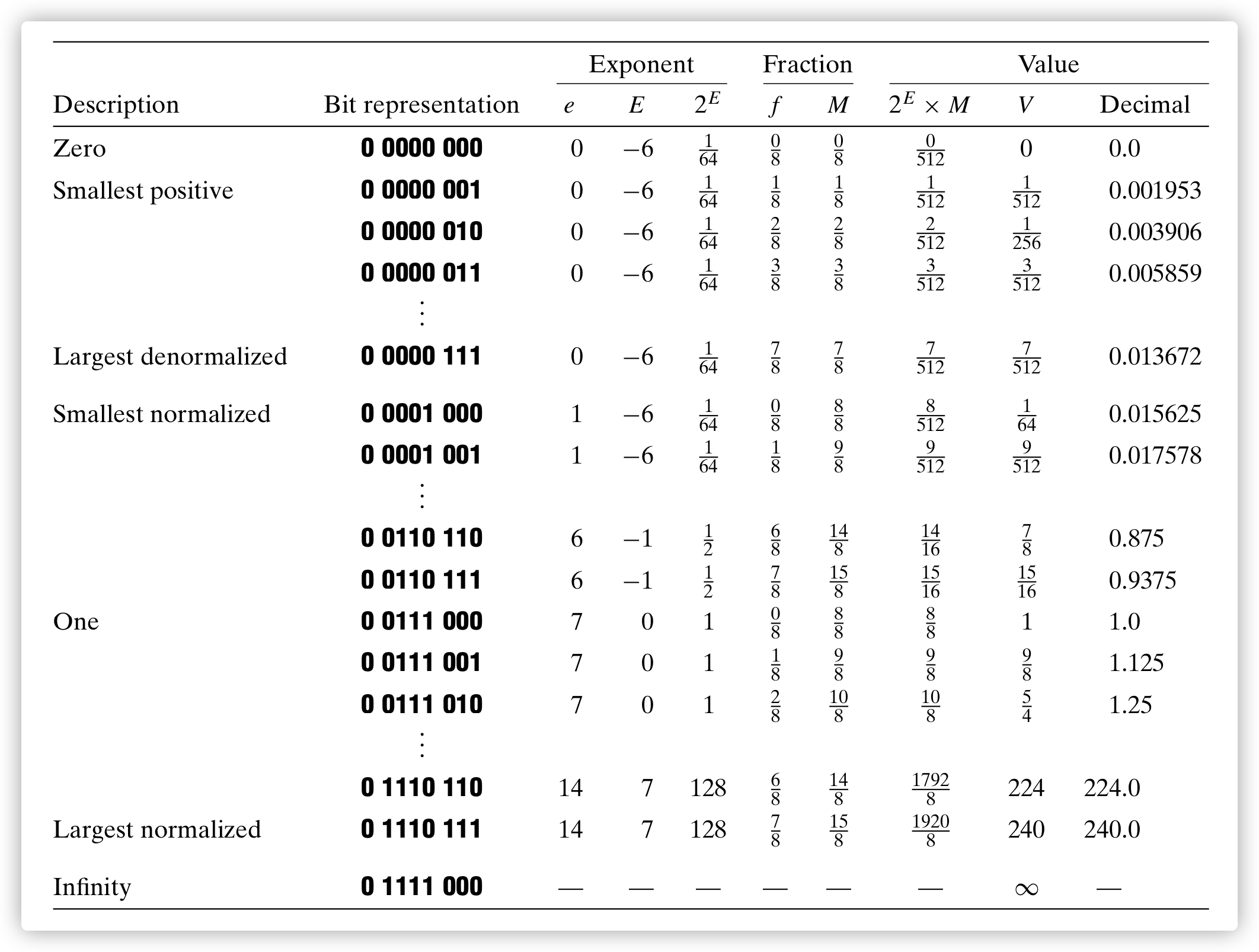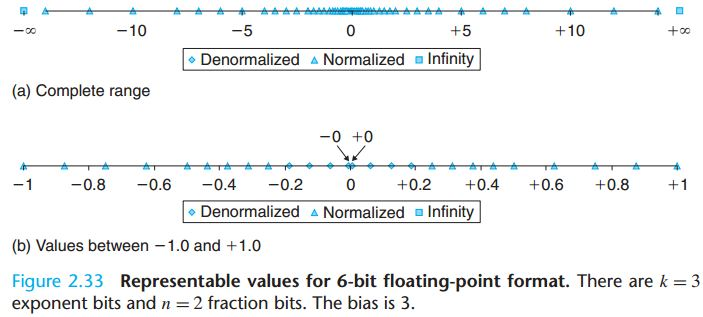 - 可以看到非规格化数 0 0000 111 到规格化数 0 0001 000 的平滑转变;