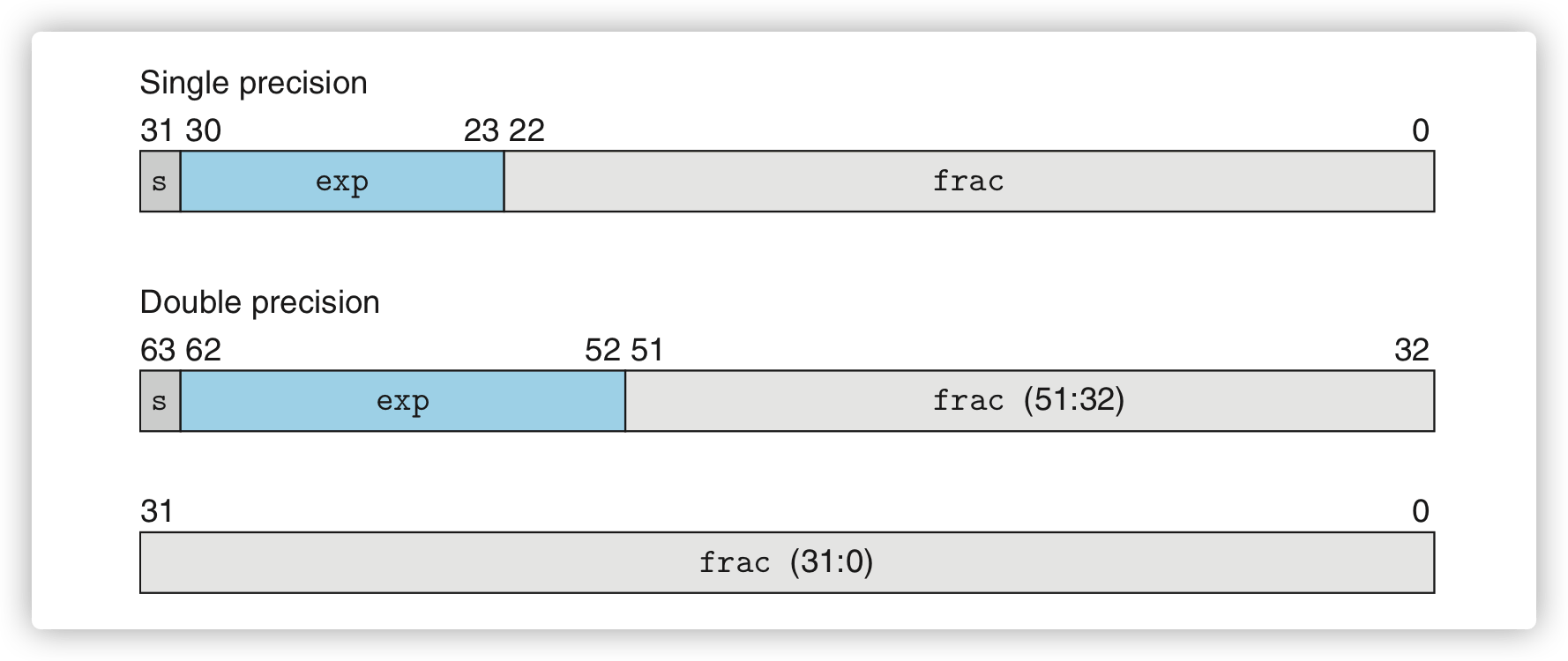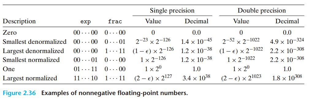 - 综上,对规格化数,单精度的指数范围为 -126~+127, 双精度的指数范围 -1022~+1023