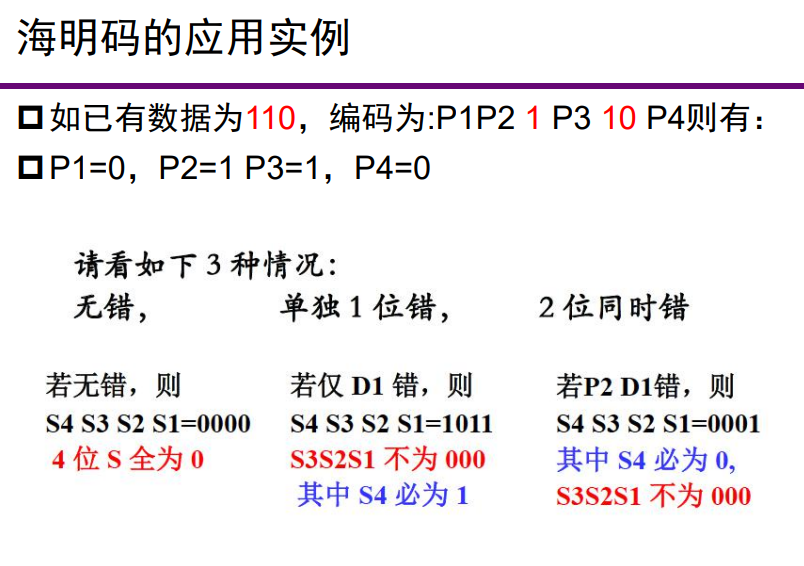 - 用其他各校验位及各数据位进行异或运算求校验位 P4 的值,用于区分无错、奇数位错、偶数位错 3 种情况:总校验位 P4 = P3 ⊕ P2 ⊕ P1 ⊕ D3 ⊕ D2 ⊕ D1