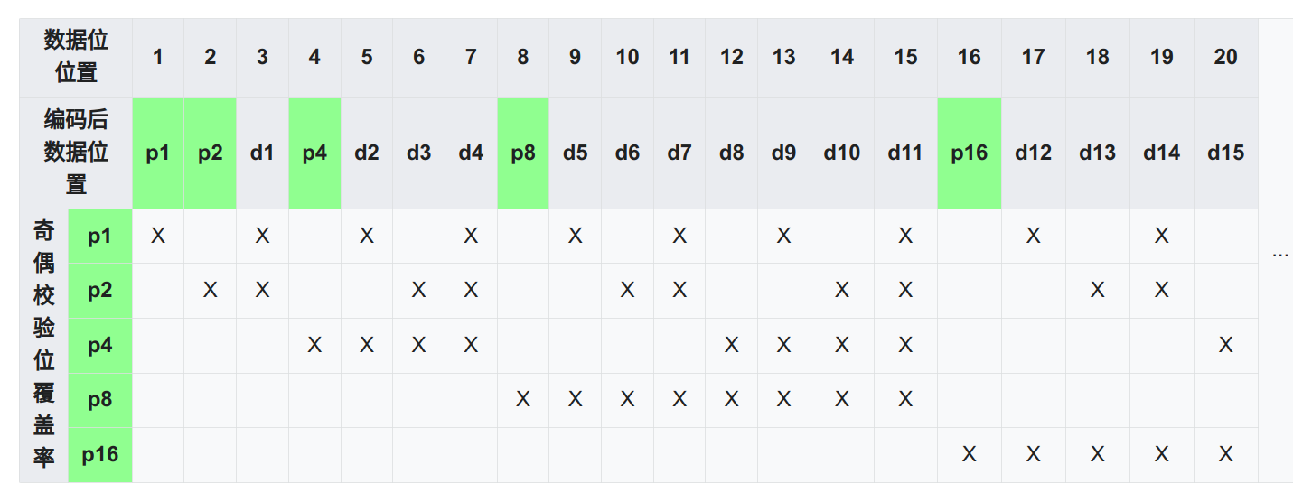 - 位数 r 和 k 的关系:2^r≥k+r+1,即用 2^r 个编码分别表示 k 个数据 位,r 个校验位中哪一位出错,都不错