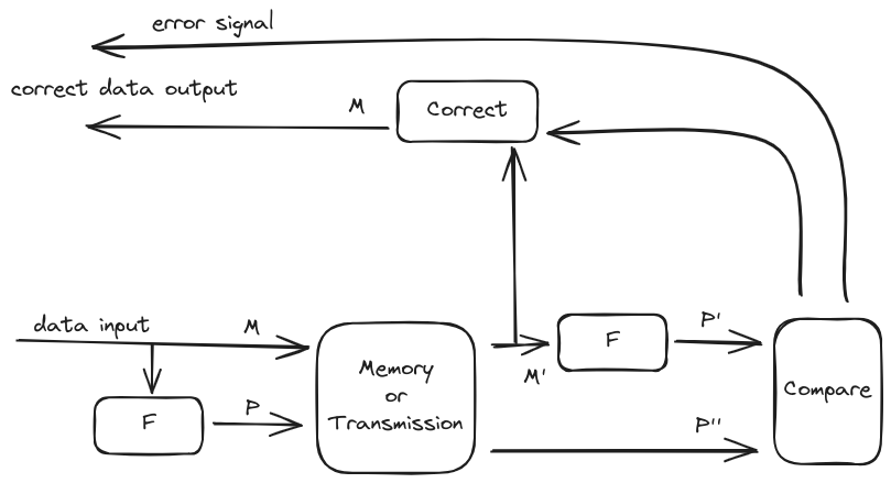 P'=F(M'),而随着 M’同时取出的校验位为 P”,通过对 P’和 P”的特定比较,可以确定是否发生错误:- 没有检测到错误,则直接传送得到的数据;