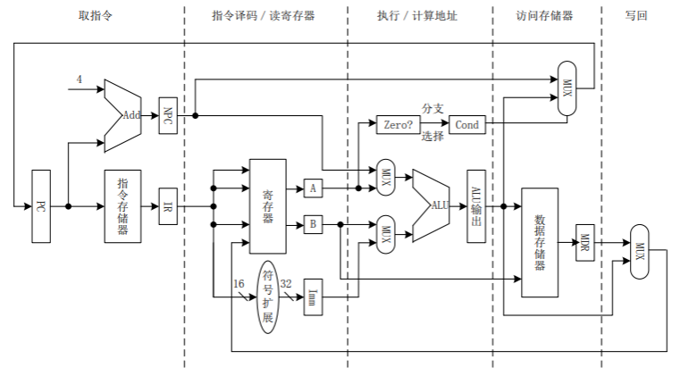 - ID/RF:寄存器组、控制信号生成部件 EXE:ALU MEM:DM、总线 WB:寄存器组