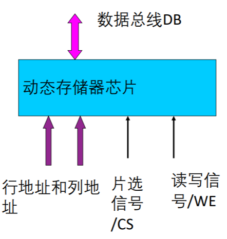 - 动态存储器集成度高,存储容量大,为节约管脚数,地 址分为行地址和列地址