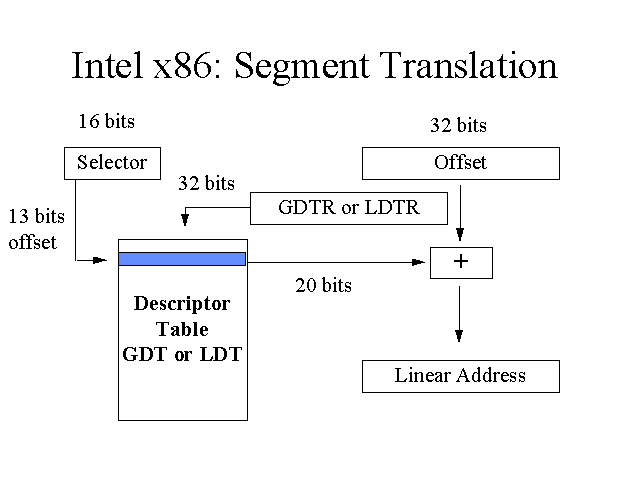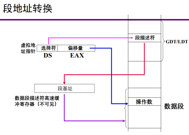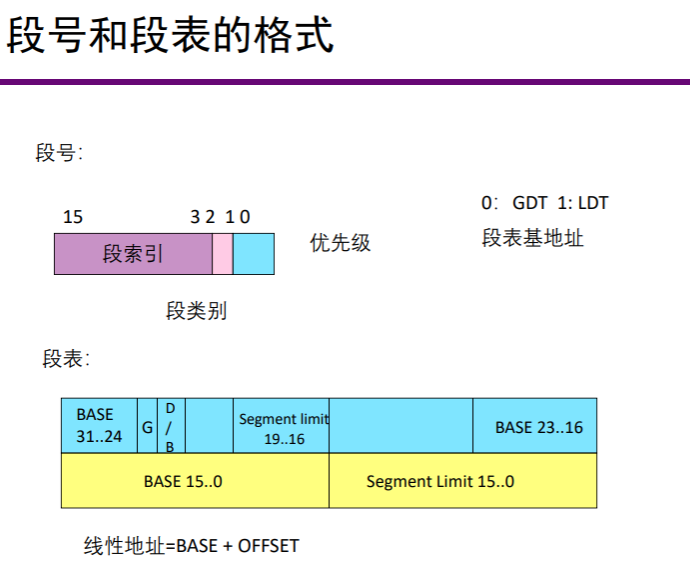 - 程序员给出的虚拟地址,格式为段号+段内偏移(16 位 +32 位),每段大小不超过 4GB,一共不超过 2^14 段。(段号中有两位用来表示段优先级)