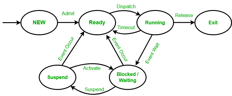 - 添加到对应状态的调度队列:将调度队列维护为链表,新进程放在就绪、就绪/挂起链表中;