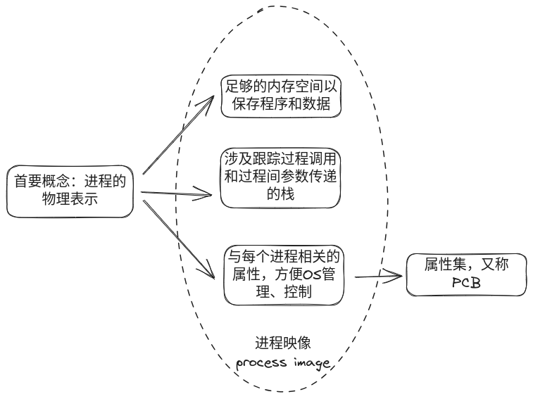 - 进程的物理表示——进程映像:程序、数据、栈、属性集;