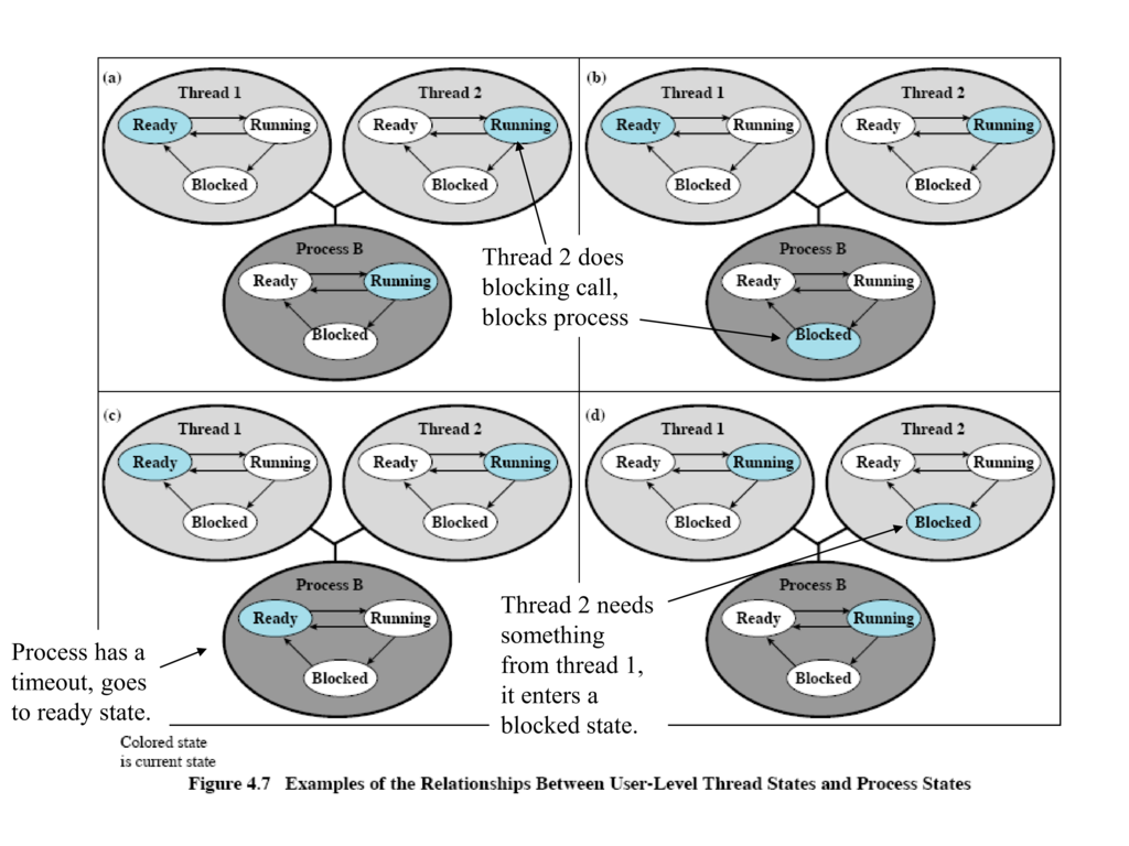 - ==一个线程发生阻塞时,会同时阻塞进程中其它所有线程==(如上图 b)