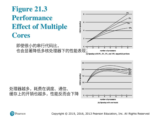 - 即使很小的串行代码比,也会显著降低多核处理器下的性能表现;