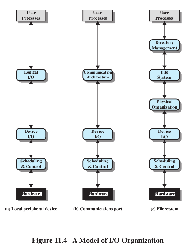 - 设备 I/O:请求的操作和数据被转换为 I/O 指令序列、通道命令和控制器命令,这一层使用缓冲技术提高利用率;
