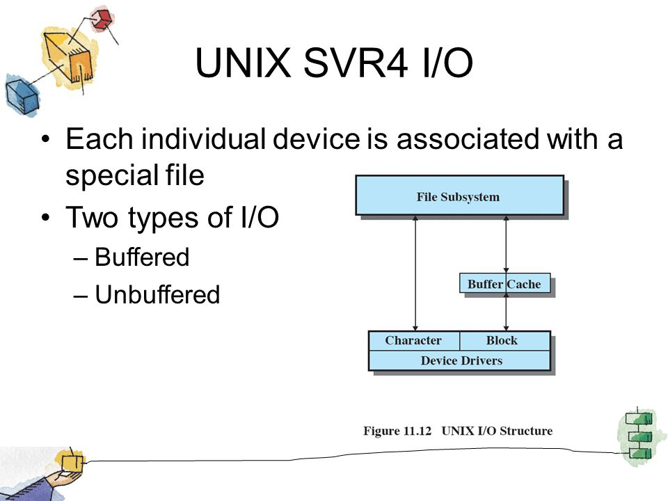 - UNIX 将 I/O 设备视作特殊文件,由文件系统管理,按照与用户数据相同的方式读写。