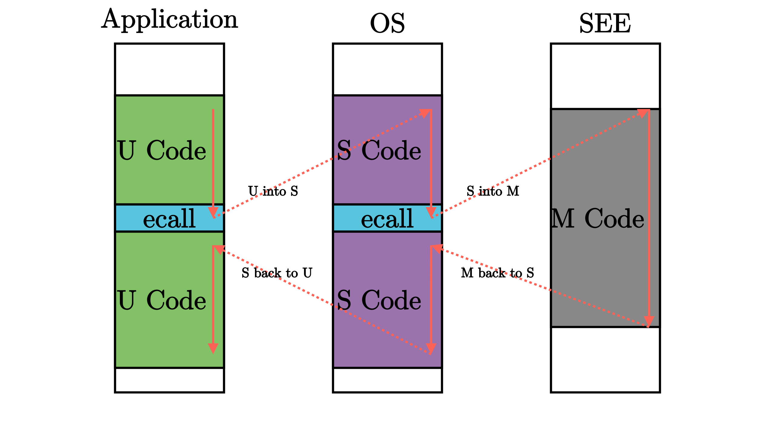 而之所以叫做二进制接口,是因为它与高级编程语言的内部调用接口不同,是机器 / 汇编指令级的一种接口。事实上 M/S/U 三个特权级的软件可分别由不同的编程语言实现,即使是用同一种编程语言实现的,其调用也并不是普通的函数调用控制流,而是 陷入异常控制流 ,在该过程中会切换 CPU 特权级。因此只有将接口下降到机器 / 汇编指令级才能够满足其跨高级语言的通用性和灵活性。