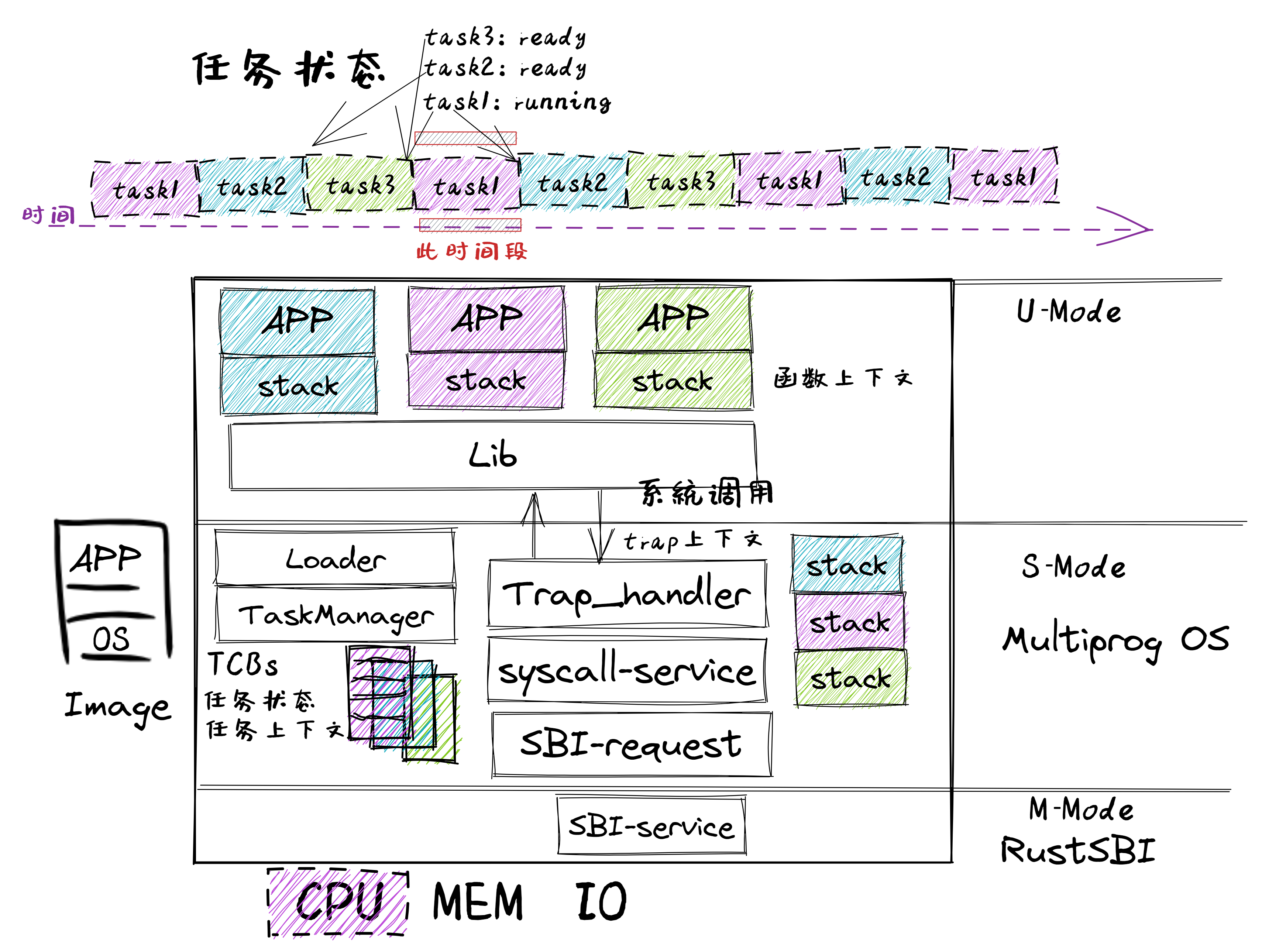 - 并通过进一步改进 TaskManager 内核模块,提供任务调度功能,这样可以在收到时钟中断后统计任务的使用时间片,如果任务的时间片用完后,则切换任务。从而可以公平和高效地分时执行多个应用,提高系统的整体效率。