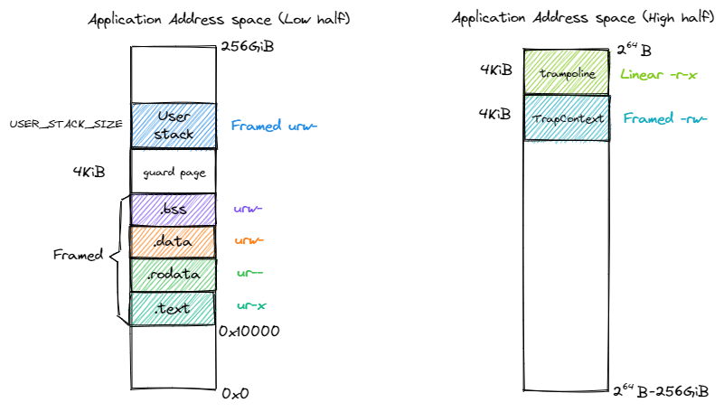 在创建应用地址空间的时候,我们需要对 get_app_data 得到的 ELF 格式数据进行解析,找到各个逻辑段所在位置和访问限制并插入进来,最终得到一个完整的应用地址空间: